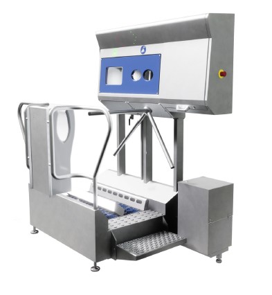 Entrata igienica completa di lavaggio, asciugatura e disinfezione mani. Inizialmente vi è un processo di lavaggio mani e asciugatura e poi, durante la fase di disinfezione delle mani tramite nebulizzazione del disinfettante (regolabile) avviene il lavaggio delle suole tramite spazzole. La barriera automatica si apre dopo un tempo impostato dall’inserimento delle mani nei cilindri, mentre risulta libero nella direzione opposta.