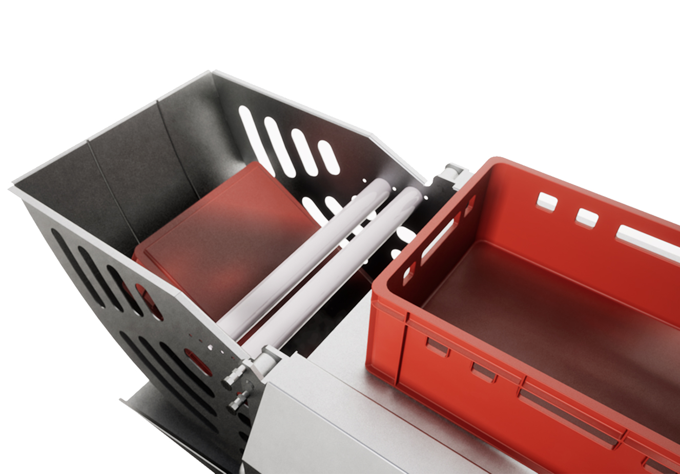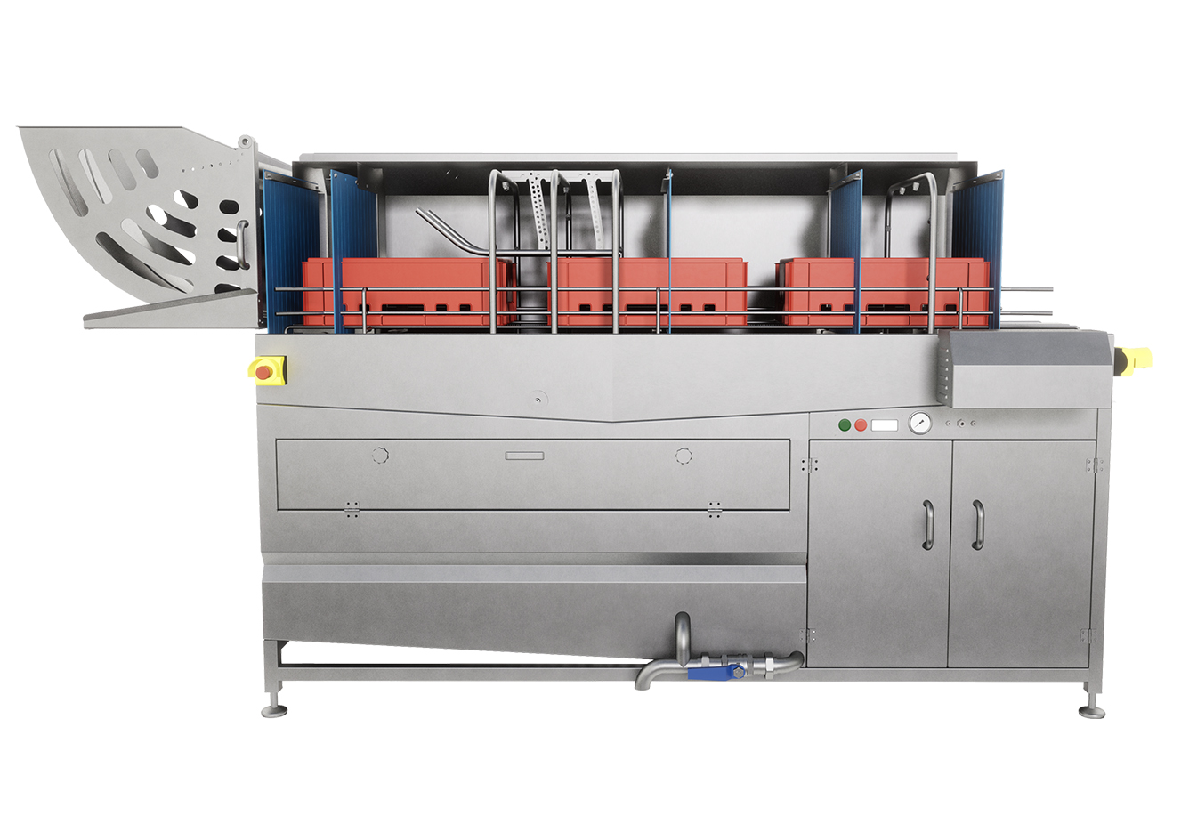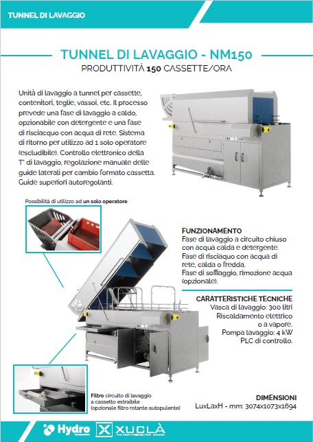 Unità di lavaggio a tunnel per cassette, contenitori, teglie, vassoi, etc. Il processo prevede una fase di lavaggio a caldo, opzionabile con detergente e una fase di risciacquo con acqua di rete. Sistema di ritorno per utilizzo ad 1 solo operatore (escludibile).