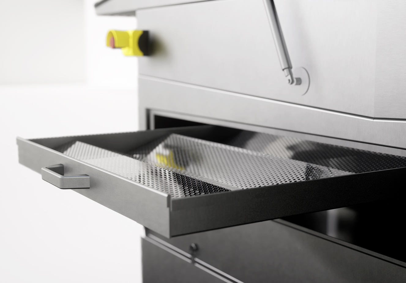 Controllo elettronico della T° di lavaggio, regolazione manuale delle guide laterali per cambio formato cassetta. Guide superiori autoregolanti.