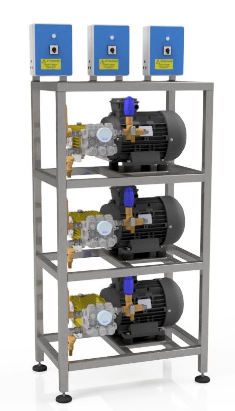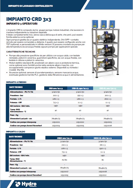 L’impianto CRD è composto da tre gruppi pompa motore industriali, che lavorano in maniera indipendente su tubazioni separate. Il telaio completamente inox, senza vasca dell’acqua di serie, che però, può essere fornita esterna come optional. Ogni pompa